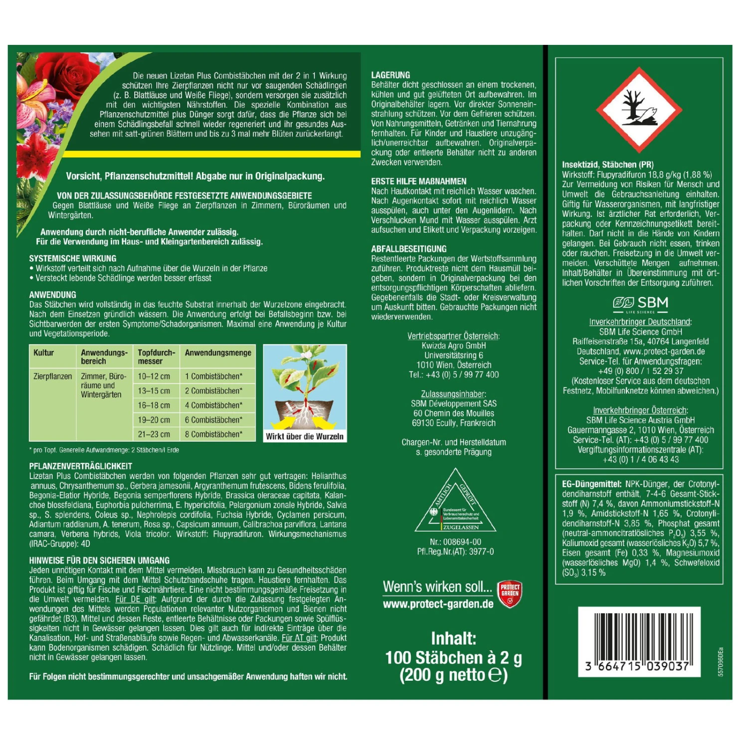 Die Lizetan® Plus Combistäbchen sind ein 2-in-1-Schutzmittel gegen die meisten saugenden Schädlinge, darunter gegen die gefürchteten Blattläuse. Neben einem effektiven Pflanzenschutzmittel enthalten die Combistäbchen das patentierte NutriONE Düngemittel, das die Zierpflanzen nach Schädlingsbefall zügig zu Kräften kommen lässt.